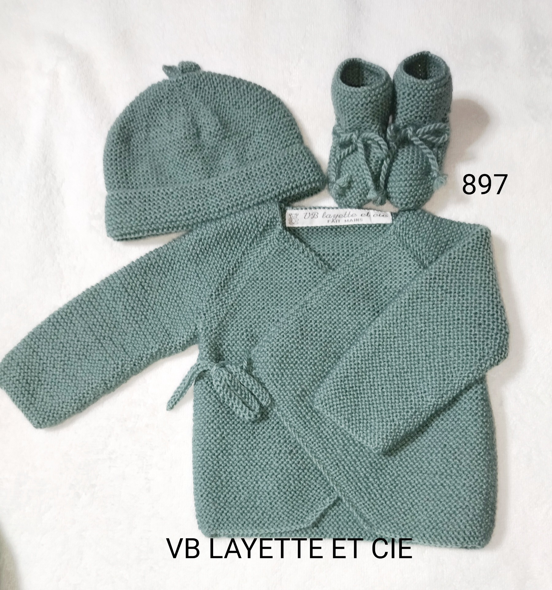 Ensemble brassière, bonnet et chaussons tricoté main en laine layette 100 % mérinos française Fonty BB mérinos de couleur vert céladon 897.