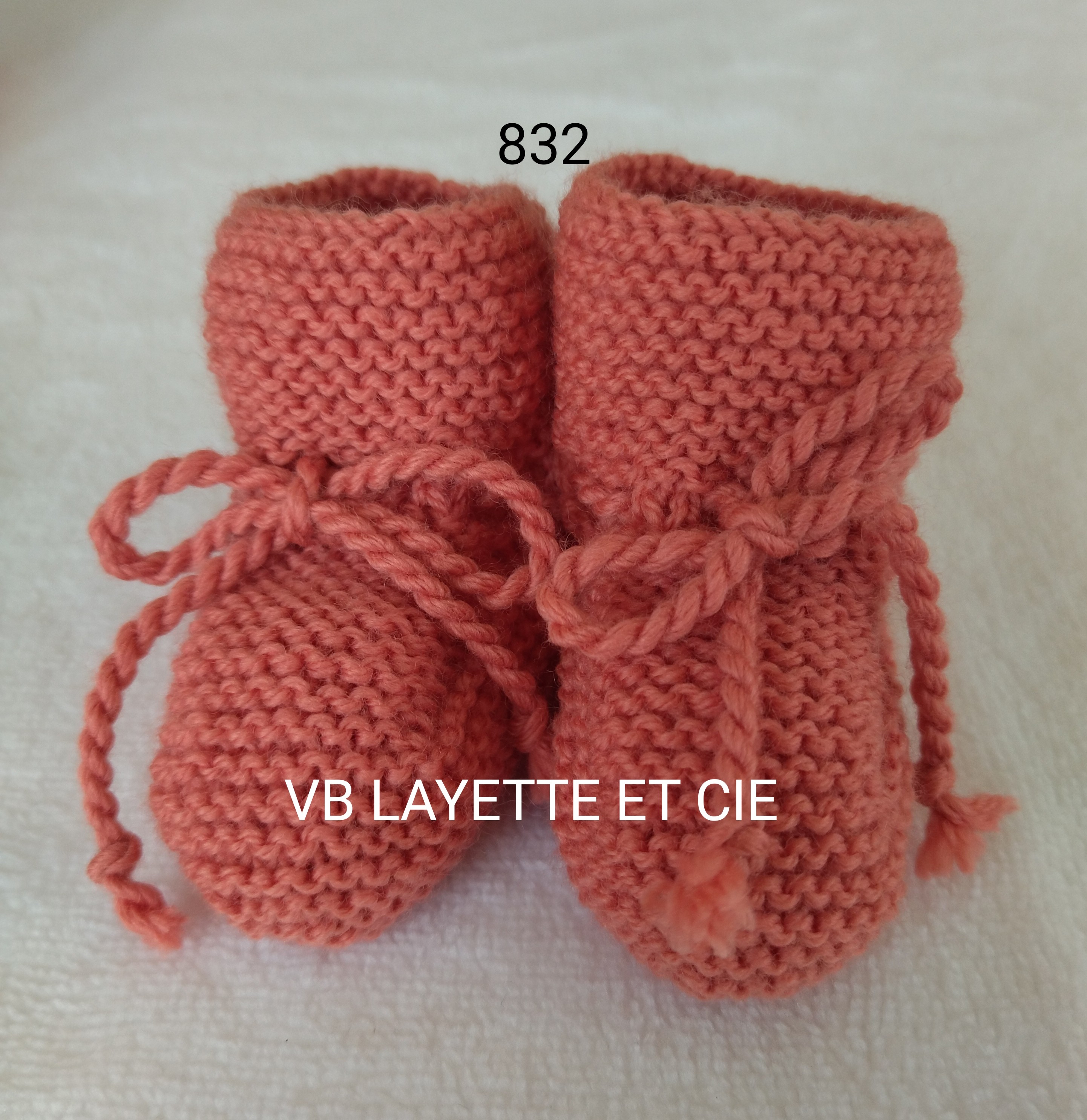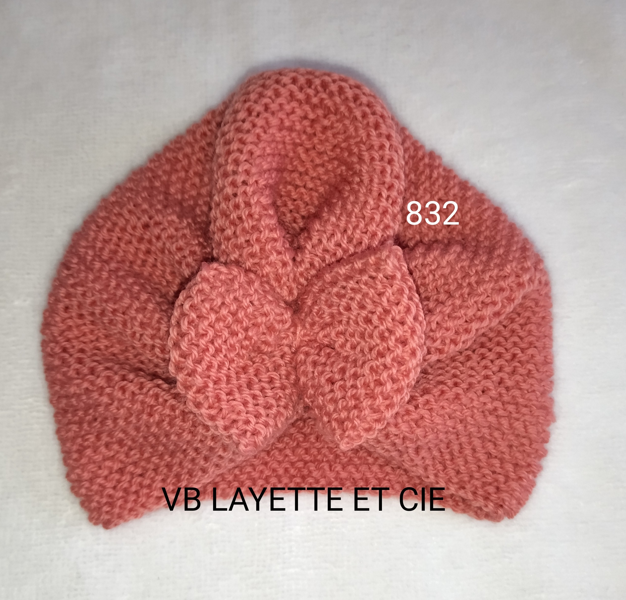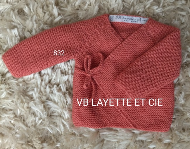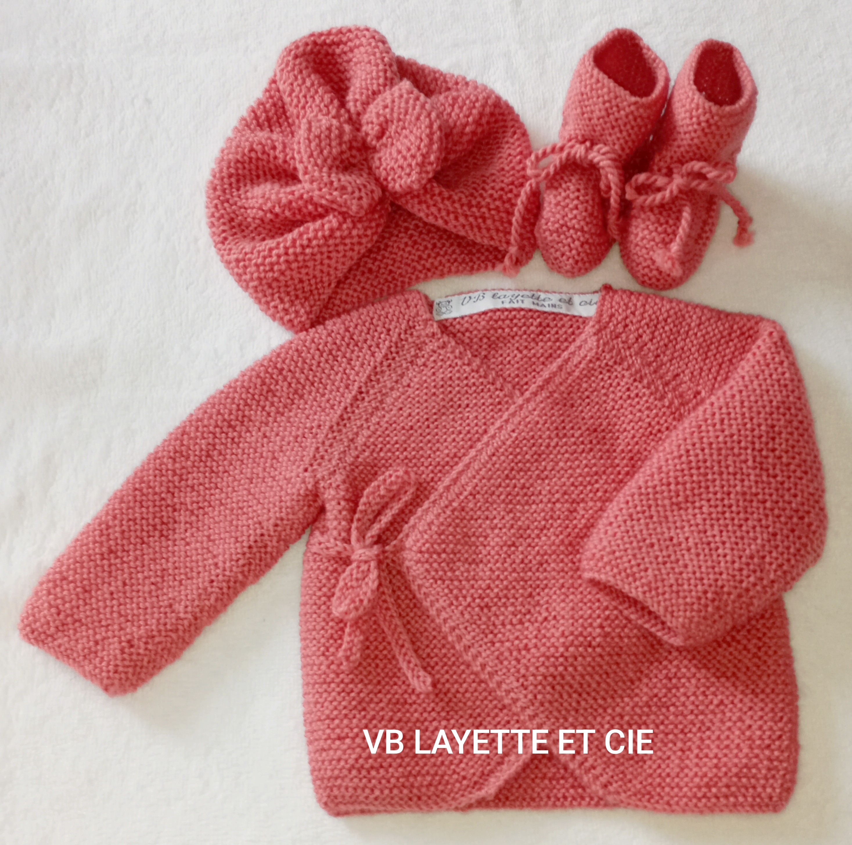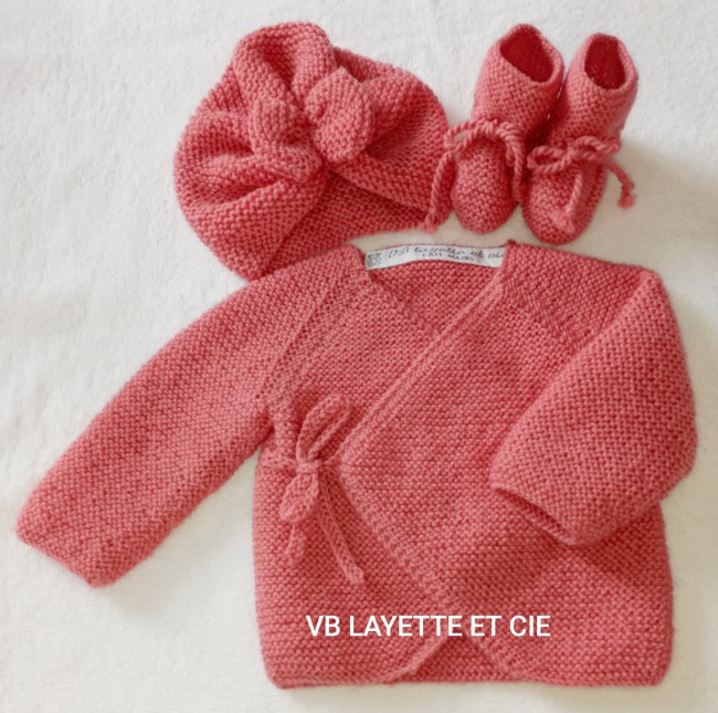 Ensemble croisé tricoté main en laine layette 100% mérinos de fabrication française Fonty BB mérinos de couleur rose corail 832 comprenant une brassière, bonnet turban et chaussons. Brassière et chaussons fermés par liens à nouer.